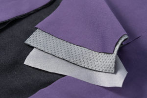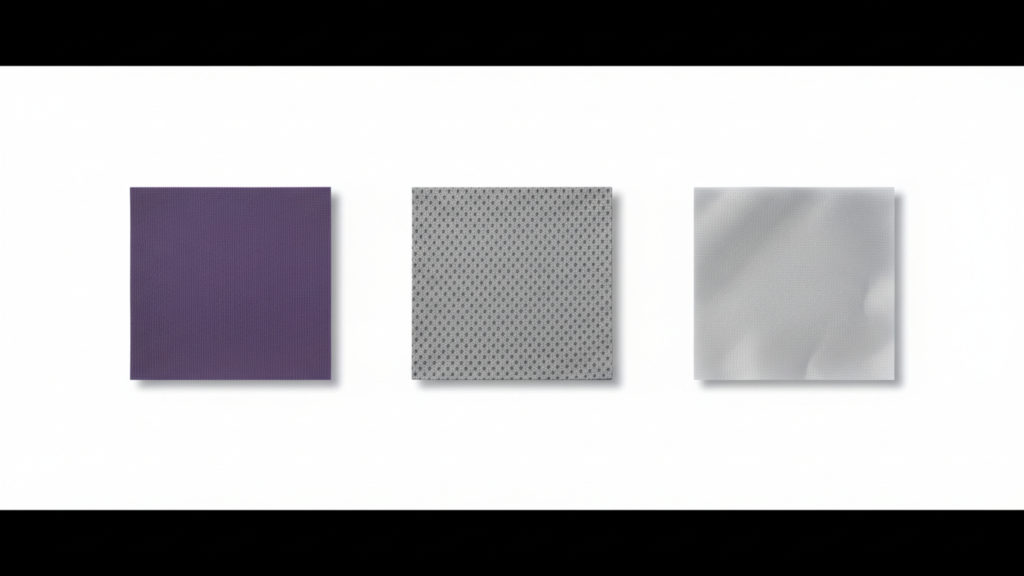 Use the provided reference image (three-layer fabric close-up) to generate a clean studio product visual. Create three separate square fabric swatches (same size, perfect squares), each representing one layer from the reference: Top swatch: the purple fabric layer texture Middle swatch: the gray textured layer Bottom swatch: the white membrane layer texture Arrange the three square swatches side-by-side horizontally with equal spacing on a pure white background. Make the swatches look photorealistic like real fabric samples: clean cut edges, slight thickness, subtle natural shadows under each square, sharp focus, high detail, accurate colors and textures matching the reference. No text, no labels, no icons, no borders, no extra objects. High resolution, product photography lighting, minimal and clean composition.